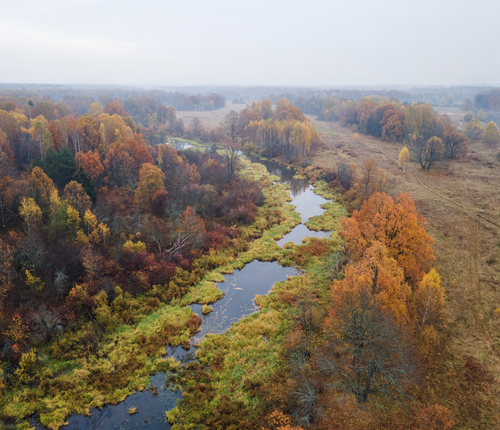 Старица Клязьмы в Петушинском районе Владимирской области. Деревья с рыжей листвой - дубы. 13.10.2020