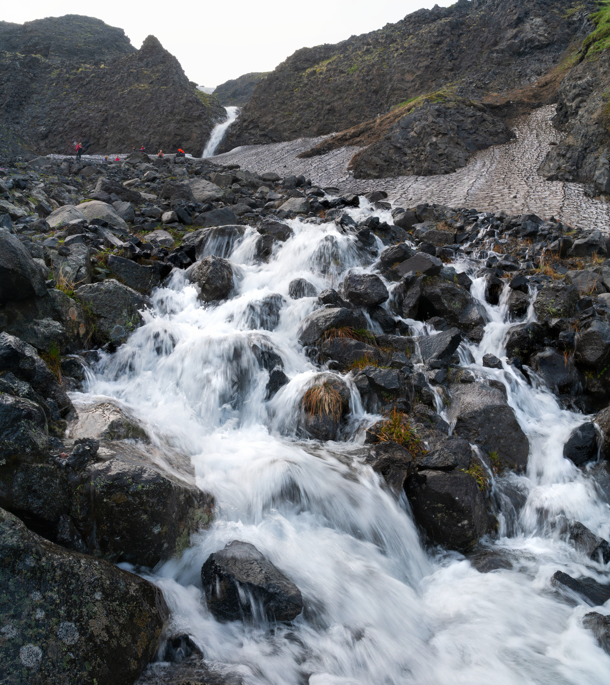 Бурный ручей с чистой талой водой. Выше по течению наша группа осматривает водопад. По словам инструкторов, в августе на этом месте лишь сухое русло.