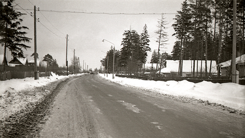 На фото (ок. 1966 года): Спустя 20 лет. Мост через Серебрянку позади. Уже проложено шоссе. Тропа (справа, за снежным валом) уже заасфальтирована. Еловый лес почти сведен на нет. Сторожка «Спецбура» находилась точно на уровне фотосъёмки.