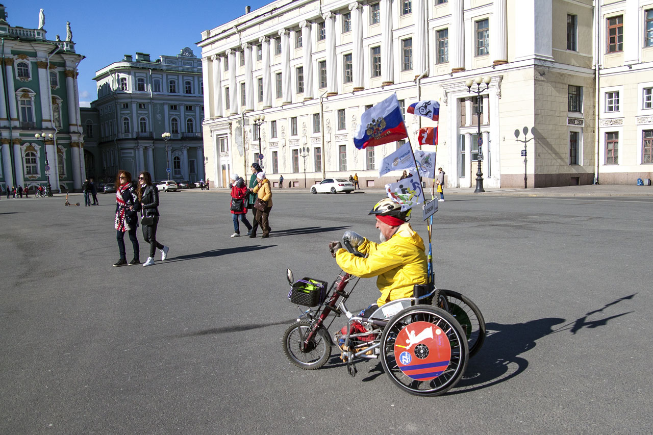 Весной в Питере на Дворцовой площади ждали своей очереди в Эрмитаж и там увидели вот этого человека на хэндбайке. Тогда просто сфотографировал его и за обилием впечатлений позабыл про эту встречу, а сейчас, когда обрабатываю завершающую часть фото из той поездки, увидел данный снимок и решил поискать информацию об этом человеке, благо, что интернет нынче это позволяет. Нашлось много чего о нём, например вот: https://volg.mk.ru/articles/2018/03/31/invalid-iz-volgograda-puteshestvuet-po-rossii-na-khendbayke.html