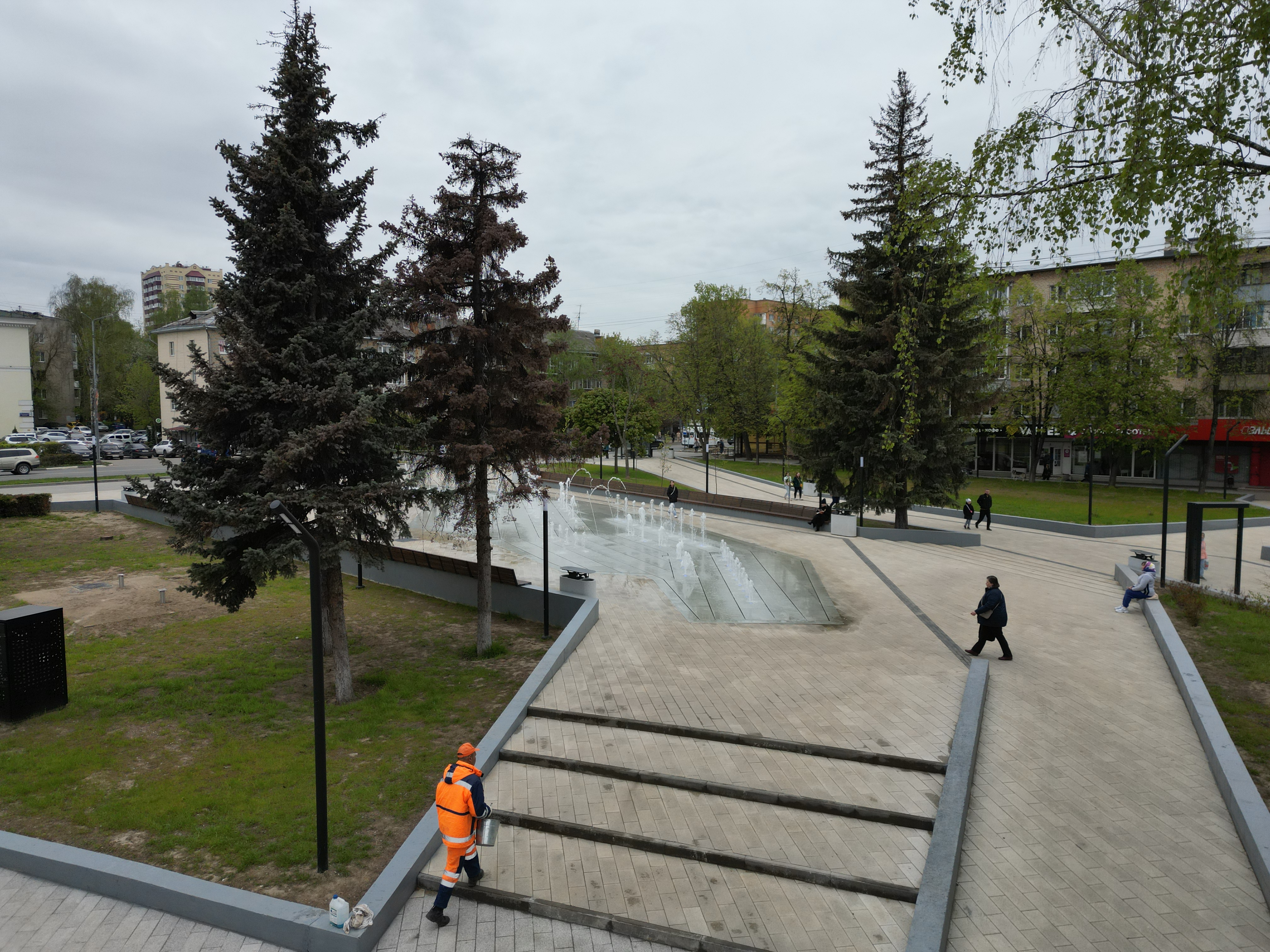Перед началом сезона плитку фонтанной зоны почистили от налета и грязи.