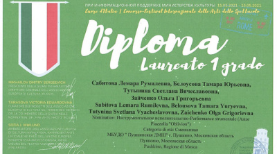 Для искусства нет преград и даже в эти непросты дни границы многих стран открыты для творческих людей. Преподаватели филиала Пушкинской музыкальной школы в посёлке Лесной приняли участие в Международном зарубежном конкурсе-фестивале "Cuore D'Italia"(г.Пиза, Италия). Квартет, в который входили Сабитова Лемара Румилевна, Белоусова Тамара Юрьевна, Тутынина Светлана Вячеславовна и Зайченко Ольга Григорьевна Квартет получил звание Лауреат 1 степени. Поздравляем с Победой!