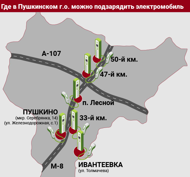 В Городском округе Пушкинский электромобили можно зарядить по адресам: