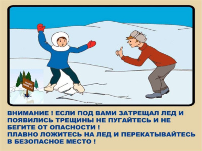* Оказавшись на тонком, потрескивающем льду, следует осторожно повернуть обратно и скользящими шагами возвращаться по пройденному пути к берегу.