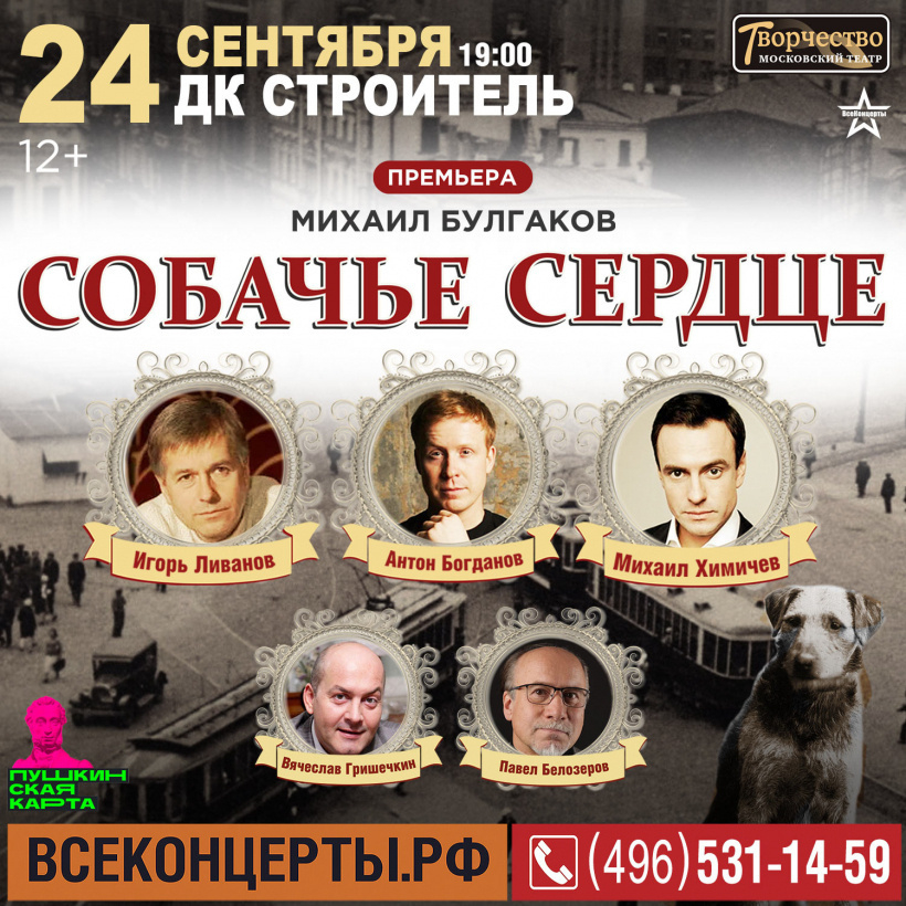Премьера! Спектакль «Собачье сердце» с известными актёрами — 24 сентября, 19:00, ДК «Строитель» (Пушкино, мкр. Заветы Ильича).